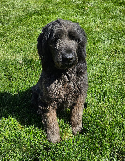 Kiddo came to Claude and I from another breeder at 10 weeks of age. He is a lovely boy, and at home is a happy, enthusiastic guy. He is friendly to those he knows, and to anyone who will play fetch with him in his yard for 10 minutes. He LOVES fetch. He also enjoys herding. His enthusiasm is a bit much for my skill level, but he has done very well with more experienced trainers. He has been exposed to some children, and has never shown aggression. He knows basic obedience, is fully housetrained, and loves his female Briard housemates. He walks well on a leash, until he has to pass a person. He is neutered, and currently shaved down. Those housemates destroyed his coat hanging on to him while he chased balls. He never even noticed, the ball is all he sees during fetch. He has happily spent time at both Claude and my houses. He has decided he doesn't like other male Briards, which is pretty common.